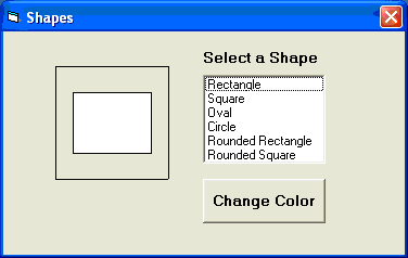 The program in this example allows the user to change the shape by selecting a particular shape from a list of options from a list box, as well as changing its color through a common dialog box.The objects to be inserted in the form are a list box, a command button, a shape control and a common dialog box. The common dialog box can be inserted by clicking on ‘project’ on the menu and then select the Microsoft Common Dialog Control 6.0 by clicking the check box. After that, the Microsoft Common Dialog Control 6.0 will appear in the toolbox; and you can drag it into the form. The list of items can be added to the list box through the AddItem method. The procedure for the common dialog box to present the standard colors is as follows: